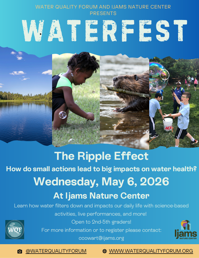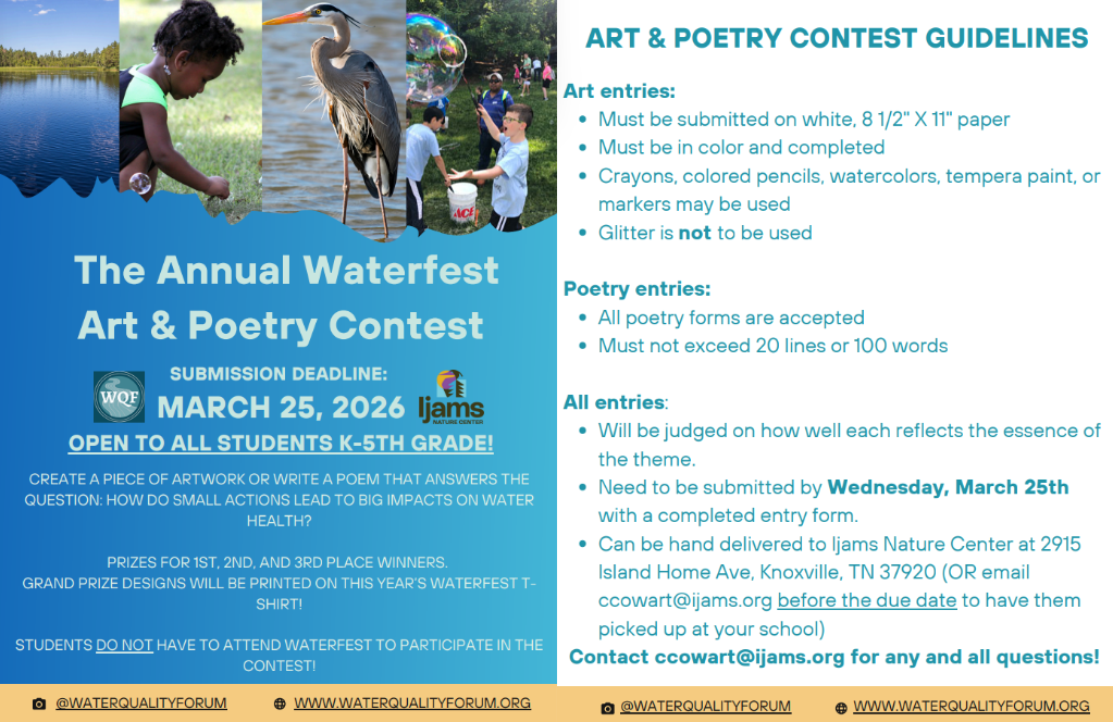 WaterFest will be making a return to Ijams Nature Center on May 6, 2026! This year’s theme will be “The Ripple Effect,” where students will learn the ways in which water filters down and impacts our lives through interactive science-based activities and performers! WaterFest is open to Knox County, Lenoir City, Maryville, and Oak Ridge area Grade 2-5 students (public, private, & homeschooled). The event is completely free and the Water Quality Forum will provide all the resources you will need for each activity. If you are a teacher interested in registering your class for this year’s event, please reach out to Charlie at ccowart@ijams.org.
